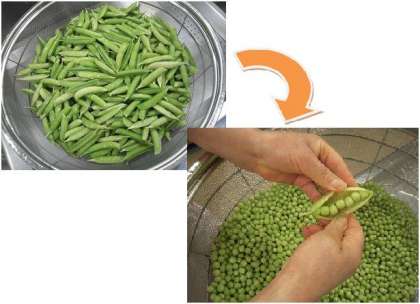 えんどうは、ちょうど春から夏の初めの今頃が旬のたべものです。給食室ではひとつひとつさやから豆を取り出して調理しました。また、えんどうの卵とじはアレルギー個別対応献立でした。卵アレルギーの児童も食べられるように、調理工程で卵を入れる前におかずをとり提供しました。