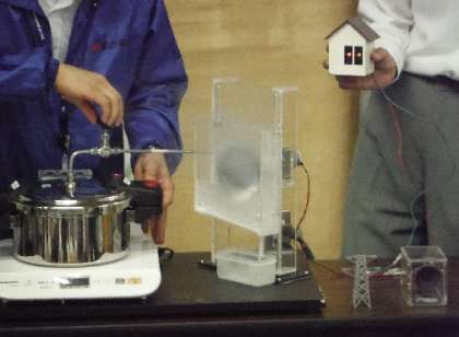 模型を使って、蒸気の力でタービンを回して発電するしくみを見せていただきました。