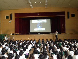 先週4月30日(木)の朝、1年生〜6年生が講堂に集まって「全校環境集会」をしました。講師は鶴見区と大阪市環境局の方にしていただきました。