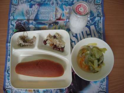 今日のこんだて:豚肉と野菜のいためもの、すまし汁、金時豆のおこわ、コッペパン、いちごジャム、牛乳