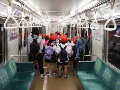 帰りの電車の中はガラガラでも立ったまま頑張りました。