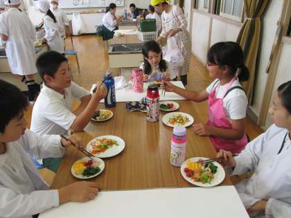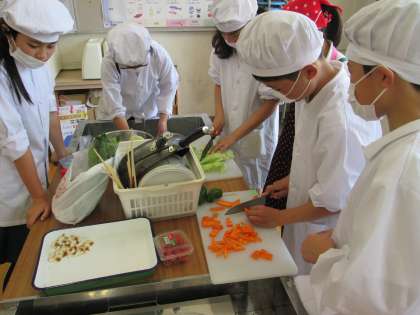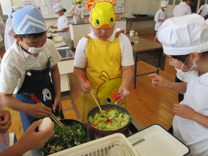 6年2組が調理実習を行いました。朝食に合うおかずを作ろうということで、各班たまご料理と野菜いためを作っていました。使える材料はたまご、ほうれん草、キャベツ、ミニトマト、にんじん、ピーマン、ベーコン、ちくわ。各班工夫をこらしておいしいおかずを作っていました。実習を生かして、家でもおいしい朝ごはんを作って食べてもらいたいです。