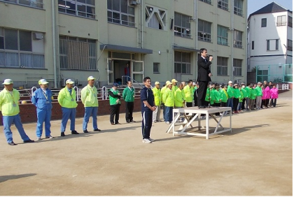 児童朝会で、安全パトロールと見守り隊の方との顔合わせ会がありました。