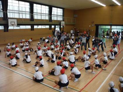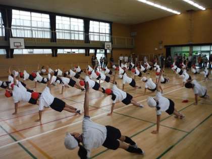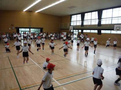 6年生も講堂で「体つくりとボール運動」です。今日はあいにくの雨で運動場がつかえませんでした。それでも、縄跳びをしたり、組体操の練習をしたり、ボールを使ってリレーをしたり、たくさん体を動かしたりしました。