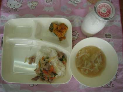 今日のこんだて:豚丼、すまし汁、焼きかぼちゃ、牛乳