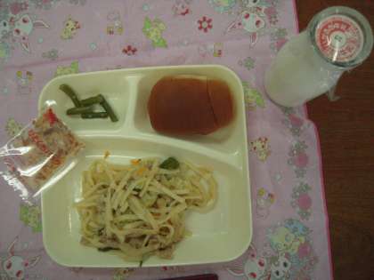 今日のこんだて:焼きうどん、三度豆のごまあえ、1/2黒糖パン、牛乳