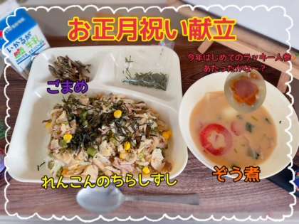 今日の給食は「正月の行事献立」の、れんこんのちらしずし・ぞう煮・ごまめでした。