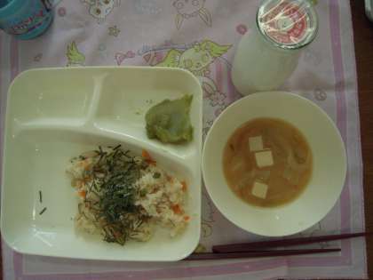 今日のこんだて:かやくご飯、みそ汁、まっ茶ういろう、牛乳