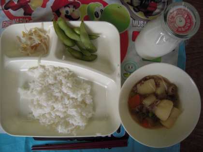 今日のこんだて:肉じゃが、もやしのゆずの香あえ、枝豆、ごはん、牛乳