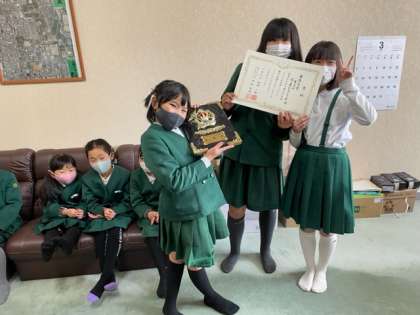 本日の児童昼会で、表彰がありました。緑連合子ども会で参加した『子ども文化祭』において最優秀賞でした。