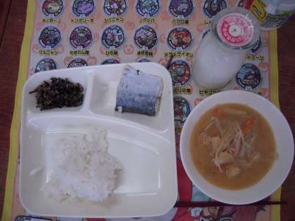 今日のこんだて:さごしの塩焼き、みそ汁、牛ひじきそぼろ、ごはん、牛乳