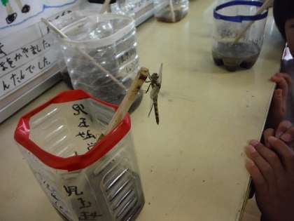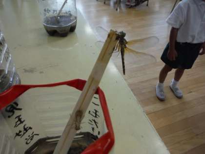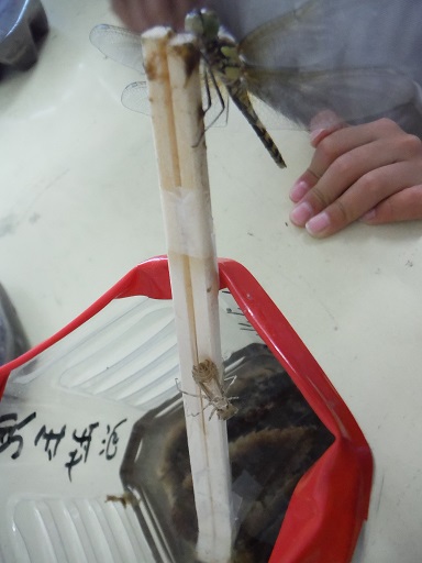 朝、学校に来ると、わりばしの先にトンボが止まっていて