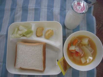 今日のこんだて:いかてんぷら、フレッシュトマトのスープ煮、キャベツのピクルス、食パン、牛乳、アプリコットジャム