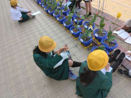 植物の観察。とてもいい天気で外での活動は気持ちよさそうでした!