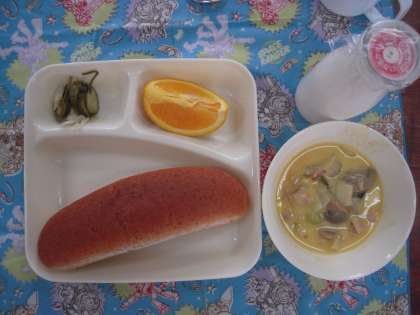 今日のこんだて:かぼちゃのクリームシチュー、ミックス海そうのサラダ、オレンジ、ライ麦パン、牛乳