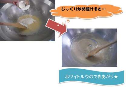写真は、今日のクリームシチューのルウを作っているところの写真です。バターと小麦粉をトロトロになるまでじっくり炒めて作っています。