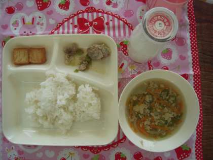 今日のこんだて:豚肉と野菜のいためもの、かきたま汁、あつあげのみそだれかけ、ごはん、牛乳