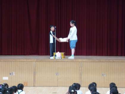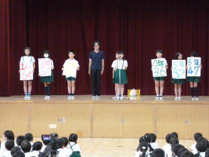 8時半から9時まで講堂で保健委員会による歯みがき集会がありました。
