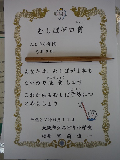 まず、むしばゼロ賞の発表です。今年は399名中、283名の児童がむしばゼロ賞で賞状をもらいました。