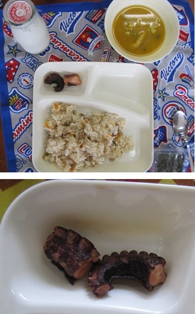 たこは体をつくる働きのある「赤」の食べ物です。血や筋肉を作る「たんぱくしつ」がたくさん含まれています。また、たこには、血中コレステロール値を下げて、血管の病気をふせぐタウリンもたくさん含まれています。
