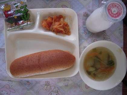 今日のこんだて:えびのチリソース、中華スープ、豆こんぶ、ライ麦パン、牛乳