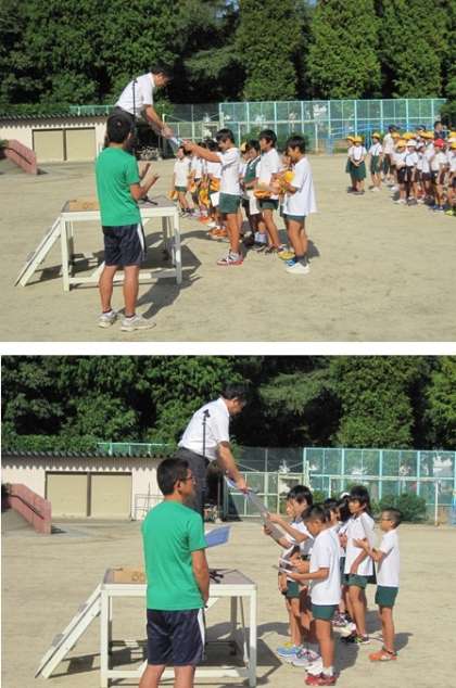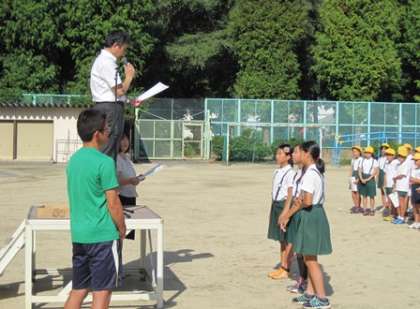 今日の児童朝会では、夏休みに行われた水泳と陸上の記録会の記録証や表彰状が参加した児童に渡されました。