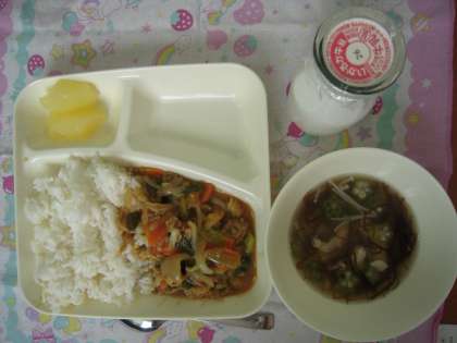 今日のこんだて:和風カレー丼、もずくとオクラのとろり汁、りんご(缶づめ)、牛乳