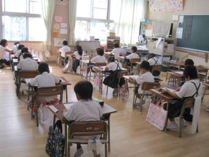つくえの向きをいつもとは違い、全員横に向けて静かにテストをしていました。