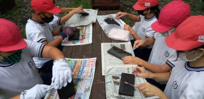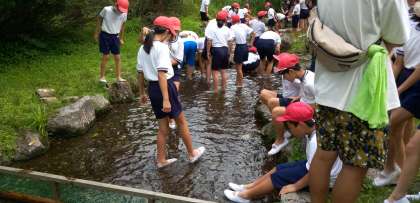 2クラスずつ交代で行います。川では魚を追いかけ歓声が、テーブルでは焼き板を真剣に磨いています。