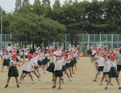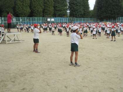 そのあと、体育環境委員の人が前に出て、みんなでラジオ体操の練習をしました。