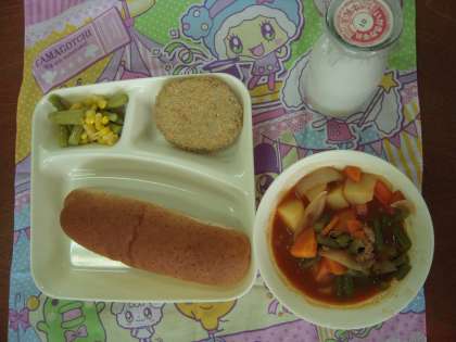 今日のカツには鶏レバーが入っています。レバーにはたんぱく質や鉄、ビタミンAなどが多く含まれています。貧血予防にもよい食べ物です。レバーというと臭みがあるイメージをお持ちの方も多いと思いますが、今日のカツは臭みもほとんどなく、子どもたちもおいしく食べていました。