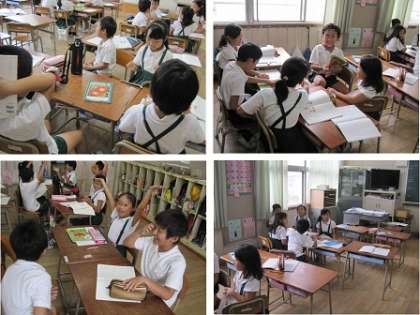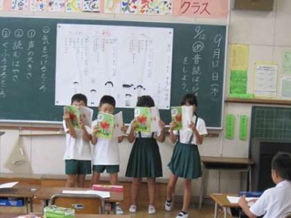 2年2組が音読発表会をしていました。グループで読み方の工夫について相談しながら練習をして、1班ずつ前で発表をしていました。