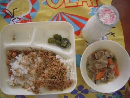 今日のこんだて:豚肉とじゃがいもの煮もの、オクラの甘酢あえ、紅ざけそぼろ、ごはん、牛乳