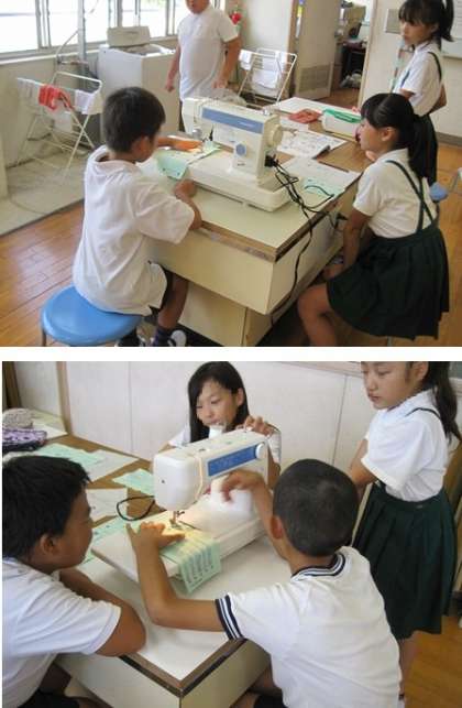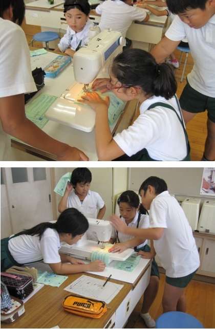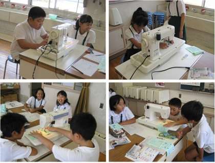 5年生が家庭科の学習でミシンの練習をしました。子どもたちの中には、初めてミシンをさわる児童も多く、最初はミシンのコントローラーをふむ足もおっかなびっくりという感じでした。けれども、時間の終わりには、ミシンの感覚にも随分慣れてきて布にあらかじめプリントされた線の上を正確にミシンで進むことができる児童が多くなっていました。