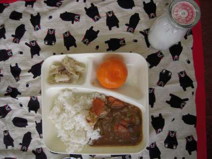 今日のこんだて:牛挽肉と夏野菜のカレーライス、ツナとキャベツのマヨネーズいため、みかん(冷とう)、牛乳