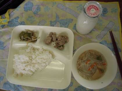 今日のこんだて:豚肉とピーマンのしょうが焼き、にゅうめん、もやしときゅうりのおひたし、ごはん、牛乳