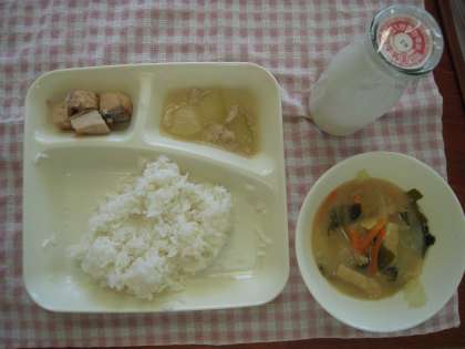今日のこんだて:さけのつけ焼き、みそ汁、とうがんの煮もの、ごはん、牛乳