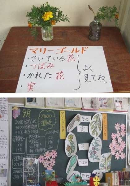 また、教室の入り口(ろか下がわ)と教室内の掲示です。