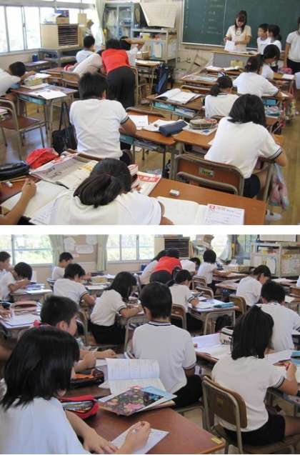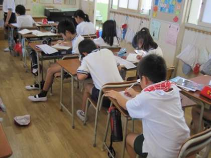 5年1組の学習の様子です。5年生の算数の学習は、習熟度別担当の先生が学級に入り込んで学習をしています。今日は計算ドリルを使って練習問題を解いていました。問題が解けた人は担任の先生にノートを見てもらっていました。