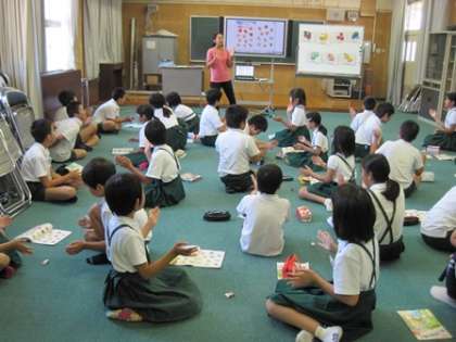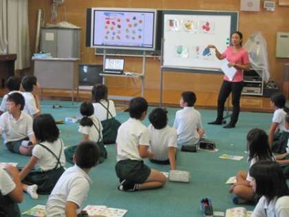 多目的室をのぞいたときちょうど5年1組のみなさんが、マジェサ先生を中心に英語のゲームをしているところでした。
