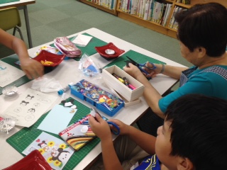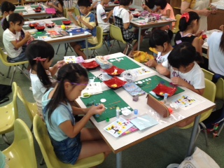 ジュニアクラフトで暑中見舞いはがき作りをしました。生涯学習ルームの方とPTAの方に協力いただきました。