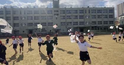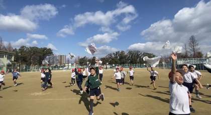 体育の時間にたこあげをしました。一生懸命走ってたこをあげました。