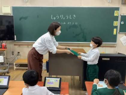 一年間お世話になった先生から、がんばったことや成長したことの言葉とともに修了証が手渡されました。