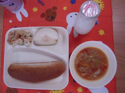 今日のこんだて:えびグラタン、トマトスープ、なし(豊水)、ライ麦パン、牛乳