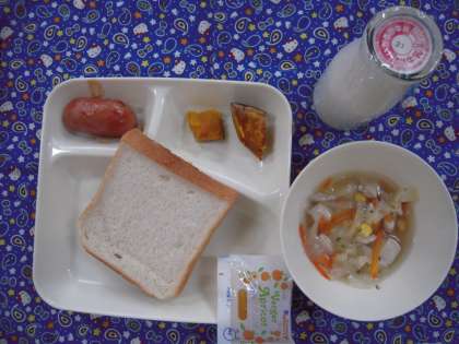 今日のこんだて:フランクフルトのケチャップソース、スープ、焼きかぼちゃ、食パン、牛乳