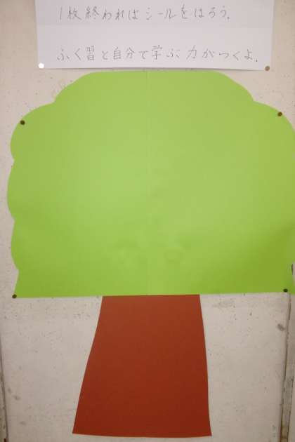 プリントが1枚終われば、木に1枚シールを貼ります。