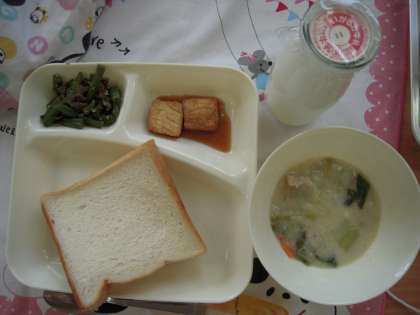 今日のこんだて:はくさいのクリーム煮、あつあげのしょうがじょうゆかけ、牛肉と三度豆のごまいため、食パン、牛乳、はちみつ