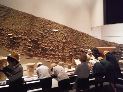 最初に見学したのは今城(いましろ)古代歴史館です。グループに分かれて見学し、埴輪や副葬品など熱心にメモを取っていました。