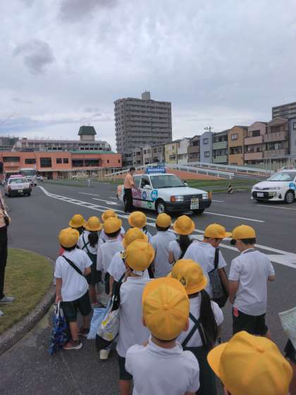 交通安全指導、どんな危険があるのかを考えながら学びます。