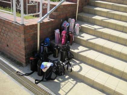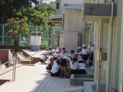 今日は暑いので、熱中症にならないように、測定が終わった後(次の種目を待つ間)は、日蔭で休憩です。お茶もしっかり準備してます。